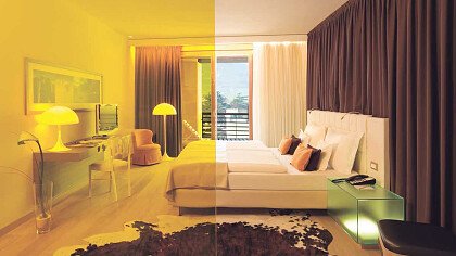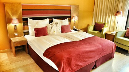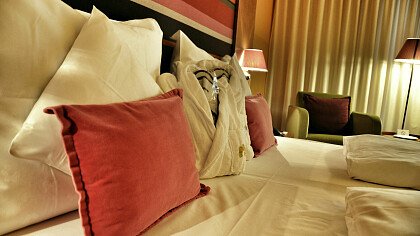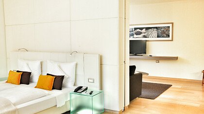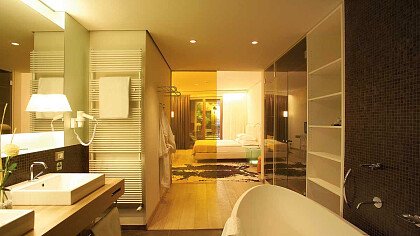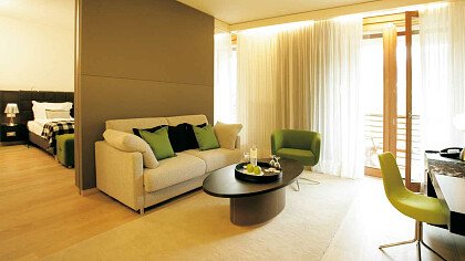 L'hotel di Merano, moderno e dal design esclusivo, è circondato da un parco di 50.000 mq. Le camere e suite, tutte molto spaziose e confortevoli, dispongono di bagno con doccia e asciugacapelli, cassetta di sicurezza, aria condizionata, teli da bagno e da sauna, accappatoi, ciabatte e borsa wellness, TV satellitare, minibar, salottino e balcone. Da provare la Suite Calla (72 mq) con vista sul parco delle Terme e tutta arredata in bianco.
