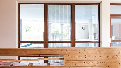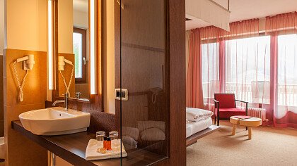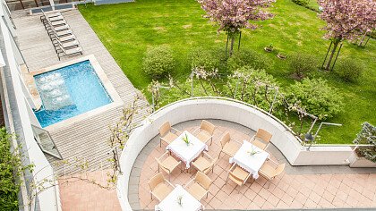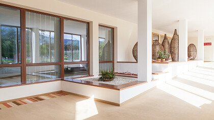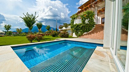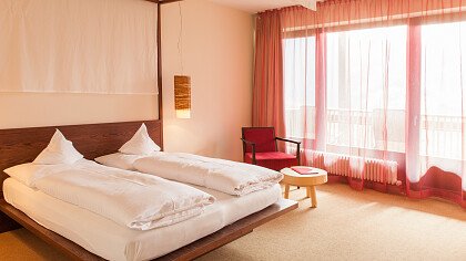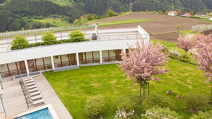 La struttura ben si armonizza con il paesaggio circostante, e gli ampi spazi, le grandi vetrate e le terrazze panoramiche creano un ambiente di eleganza con arredi in legno di melo e salice, benessere e relax. Le camere dalle calde e chiare tonalità sono arredate con gusto e dispongono di doccia, bagno/WC, TV satellitare, cassaforte, asciugacapelli, balcone, terrazza o accesso diretto al giardino.
