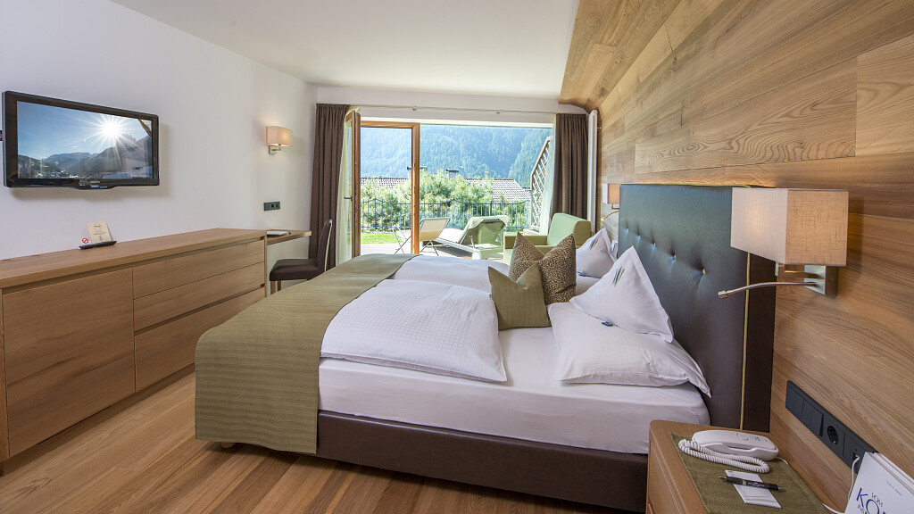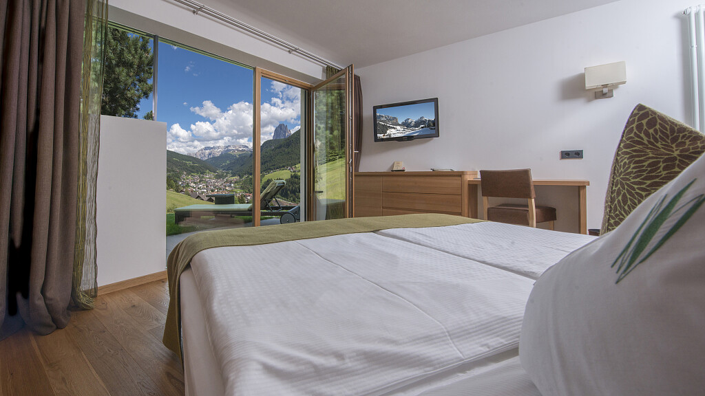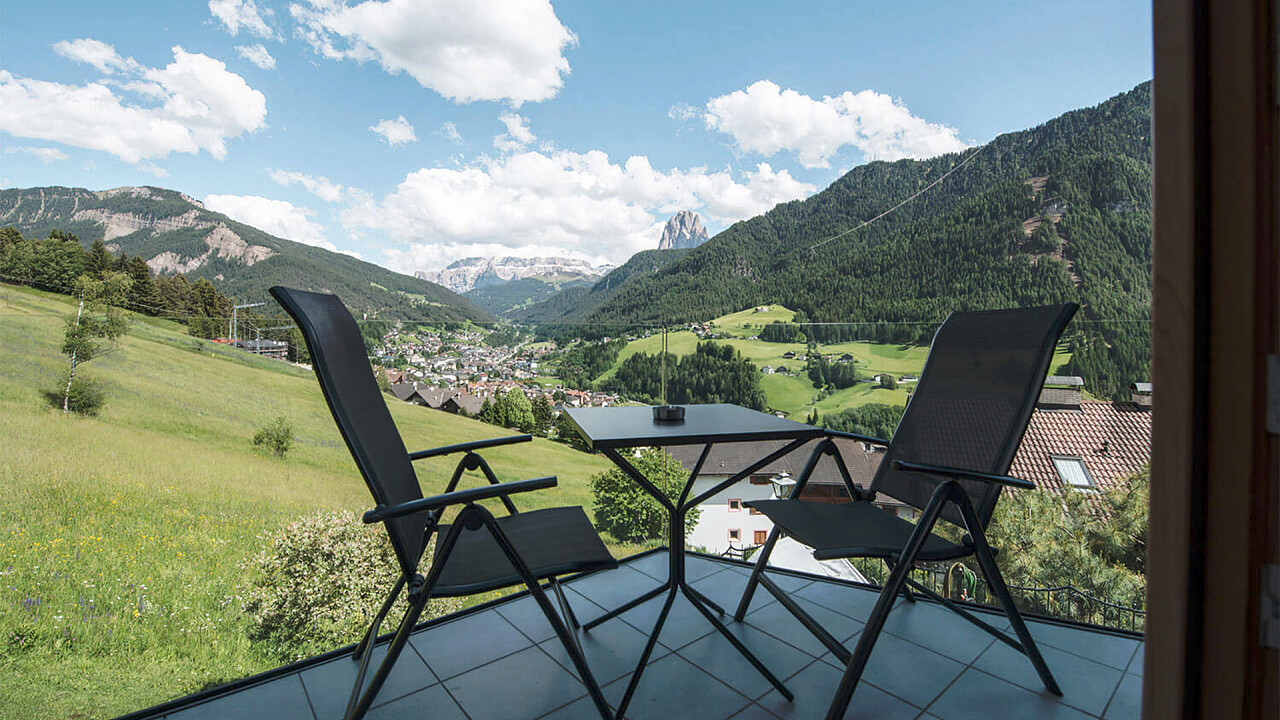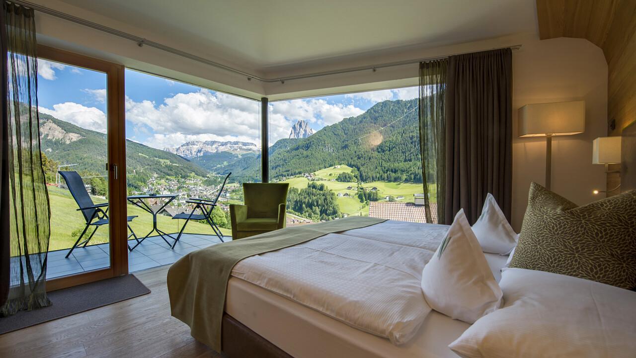 Le camere PANORAMA hanno un balcone verso sud che gode di una stupenda vista panoramica su Ortisei e le Dolomiti.Le came...