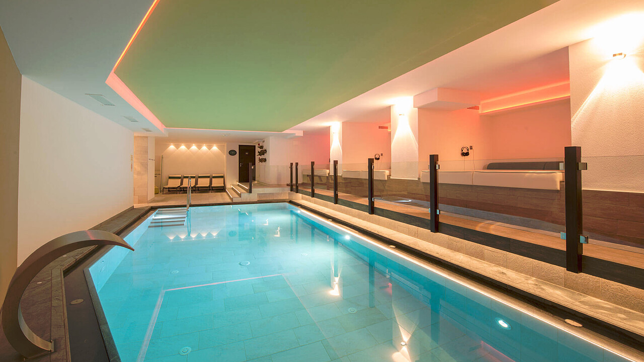 Immergetevi nell’acqua cristallina e lasciatevi avvolgere dal puro relax nella piscina coperta dell'Hotel Grien. Qui, tra getti massaggianti, una cascata rigenerante e una piacevole temperatura di 32°C, il benessere diventa un’esperienza sensoriale unica. Distendetevi sui lettini imbottiti, ascoltate la musica in cuffia e godetevi il dolce far niente. In tutta l’area wellness, l’acqua vitalizzata “Grander” rigenera corpo e mente, offrendo una freschezza pura e cristallina, proprio come quella di una sorgente di montagna.