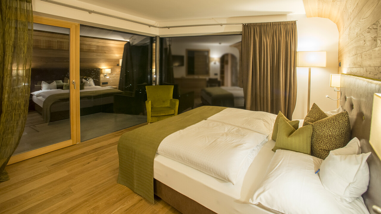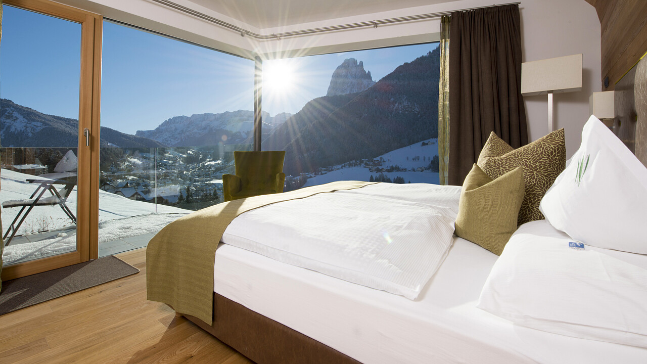 La nuova camera "101" con giardino privato ha una grande vetrata con una vista spettacolare su Ortisei e le Dolomiti. La...