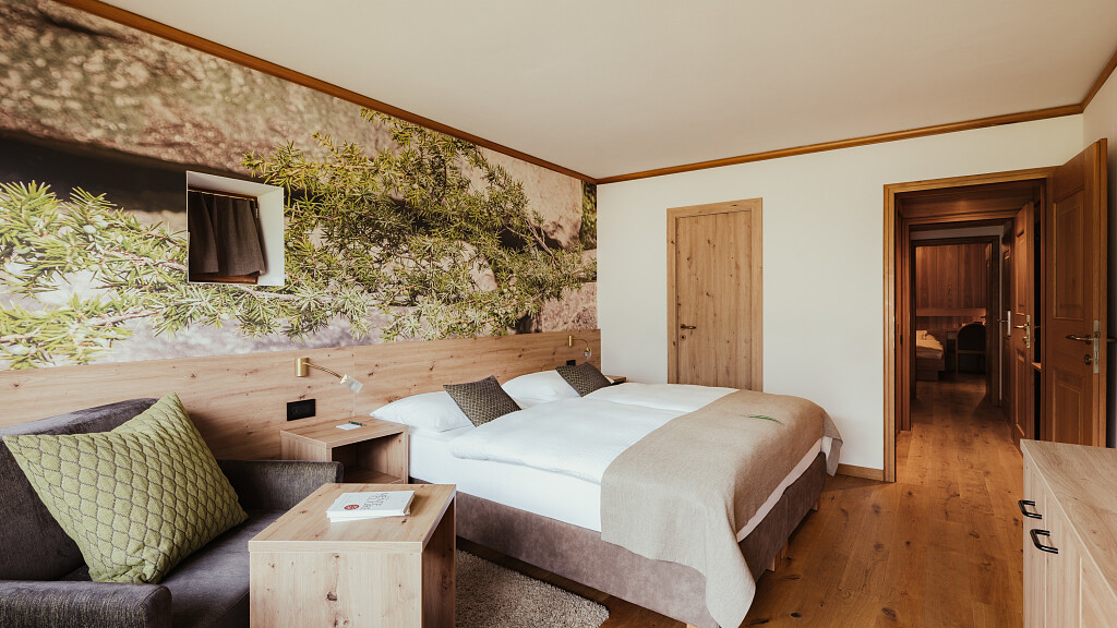 La camera „FAMILY BEAUTY“ consiste in due camere comunicanti tra di loro, entrambe con pavimento in legno. La camera "de...