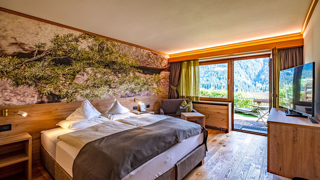 Le nuove camere DOLOMITI con giardino si affacciano verso sud ed hanno una grande facciata in vetro con una magnifica vi...