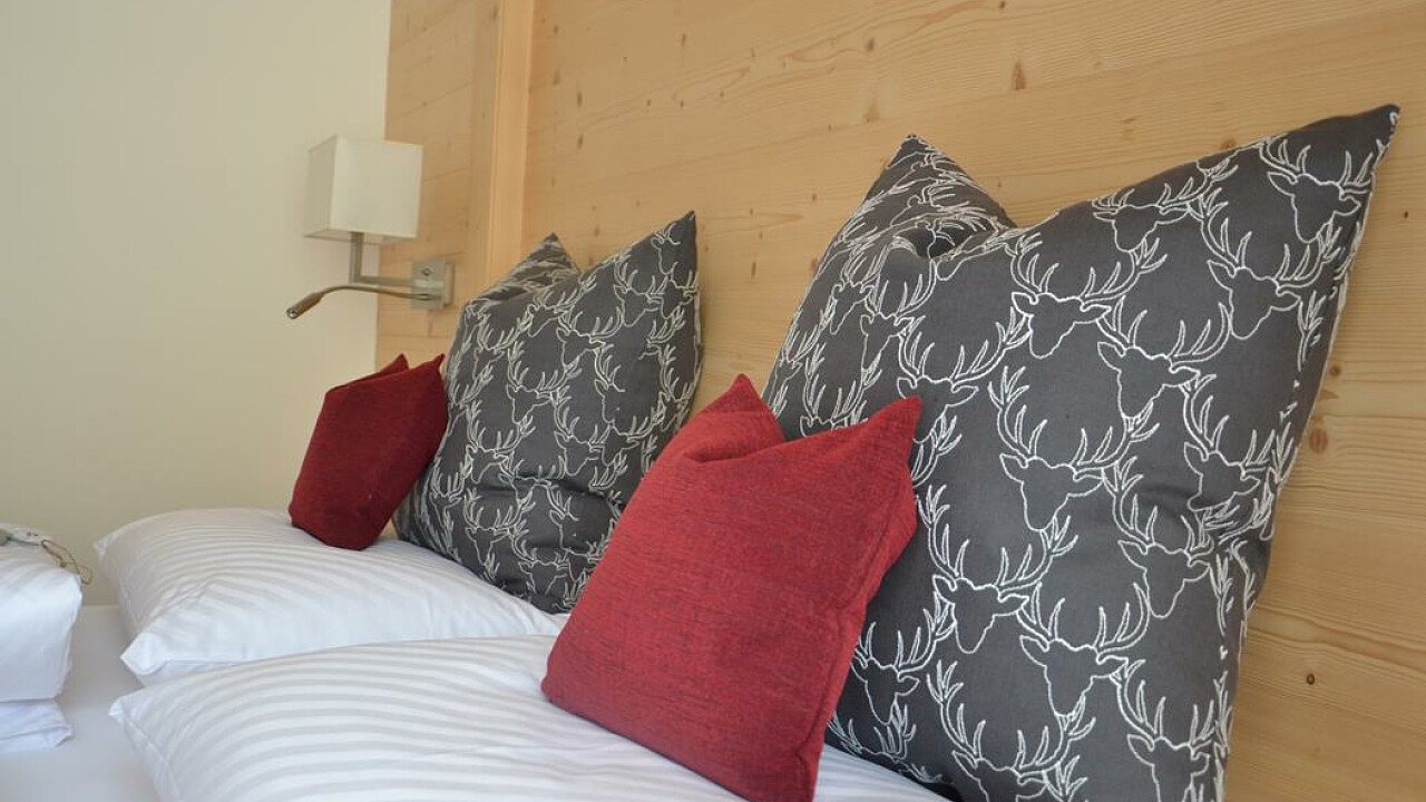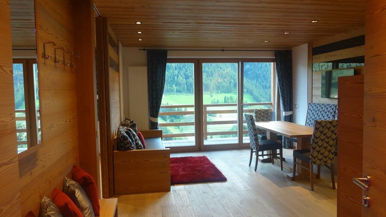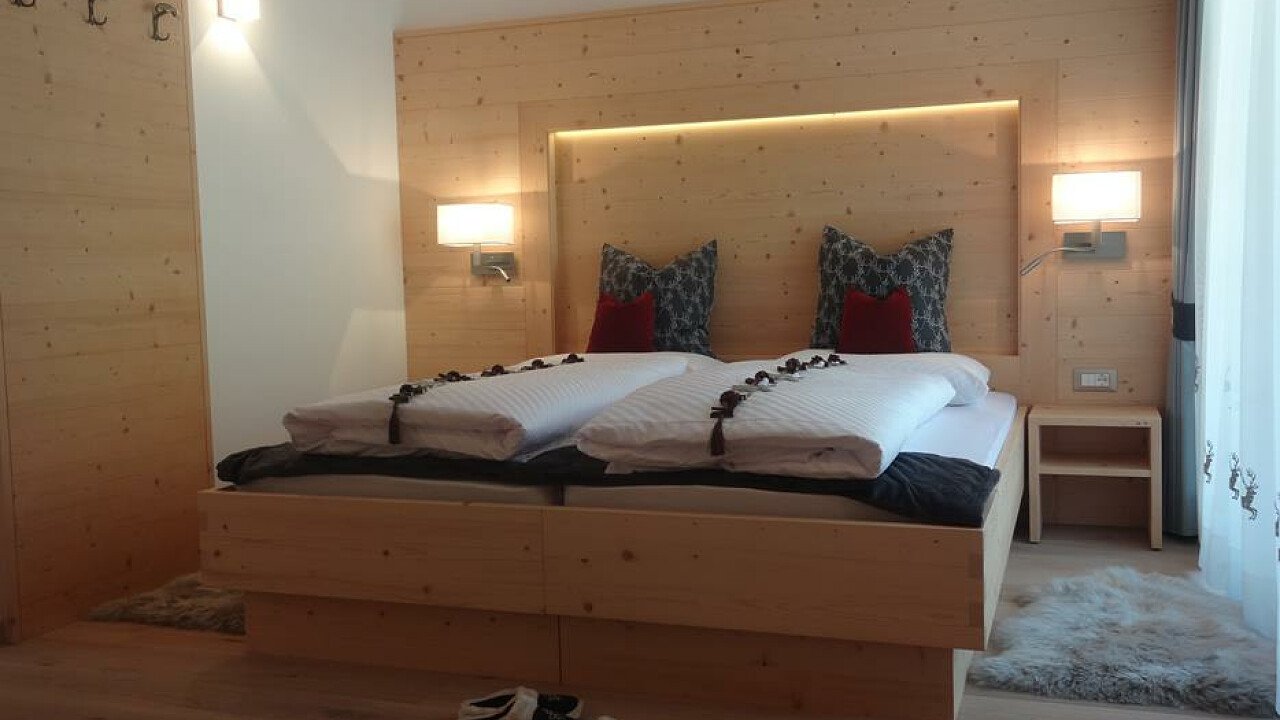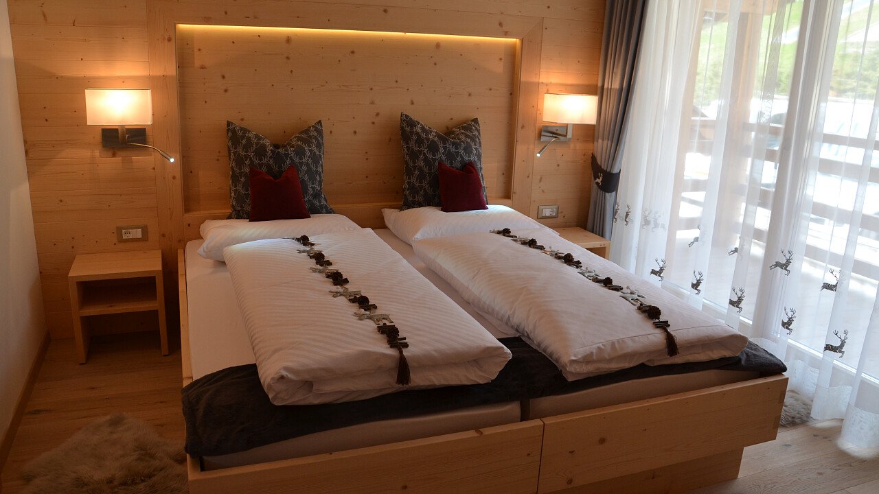 Le lussuose suite abbellite con ampie finestre panoramiche e arredi in legno di abete e larice soddisfaranno ogni vostra esigenza. Tutte le stanze sono rivolte a sud e dispongono di balcone, con una splendida vista sulle Dolomiti, o di giardino privato.