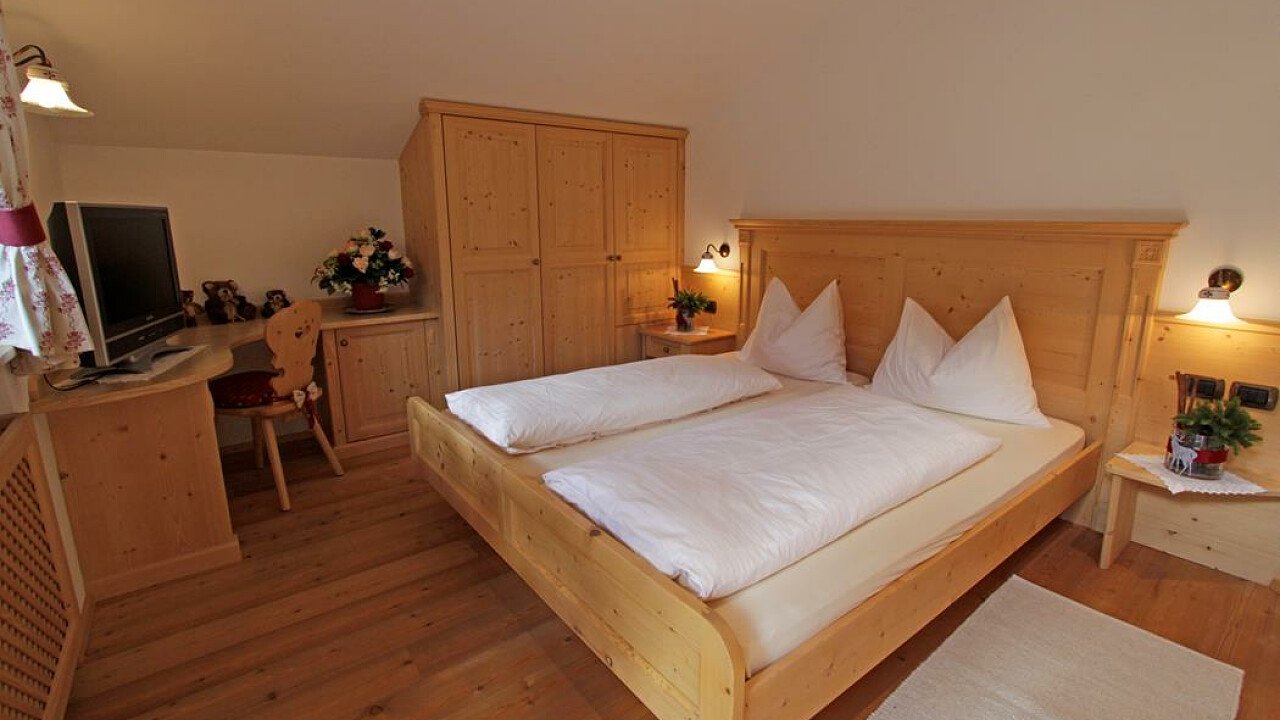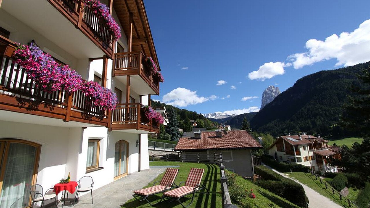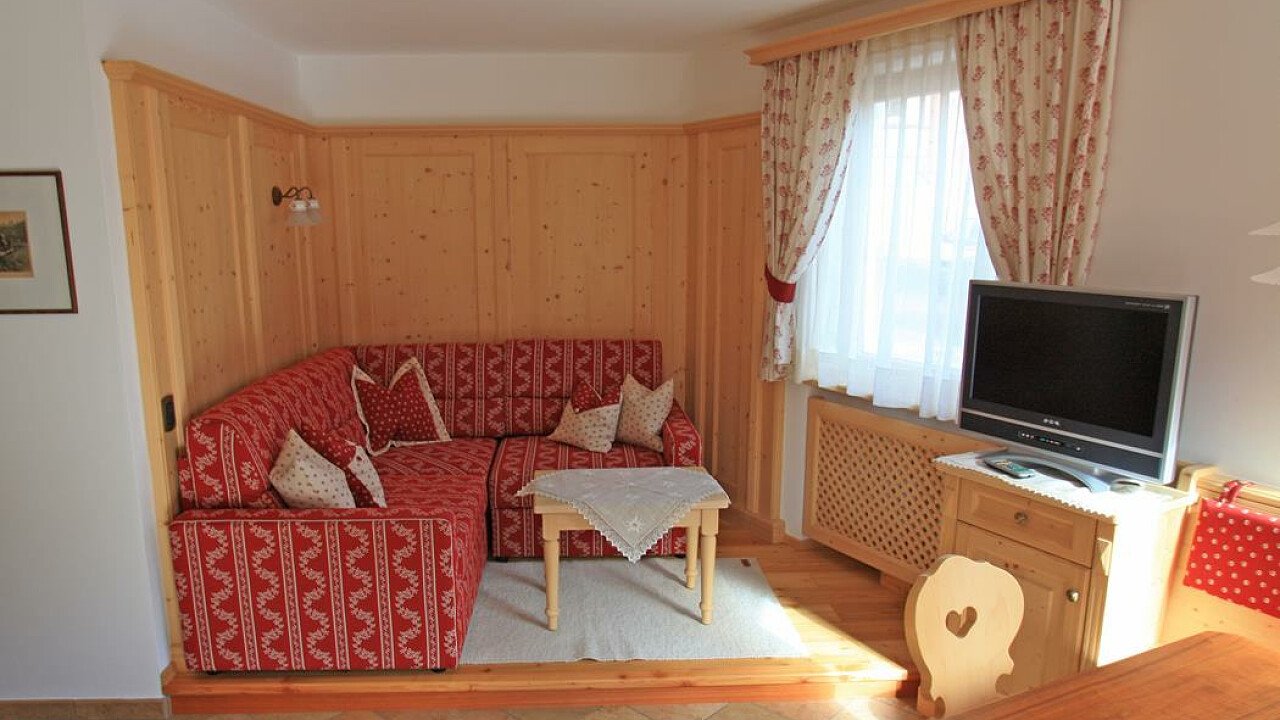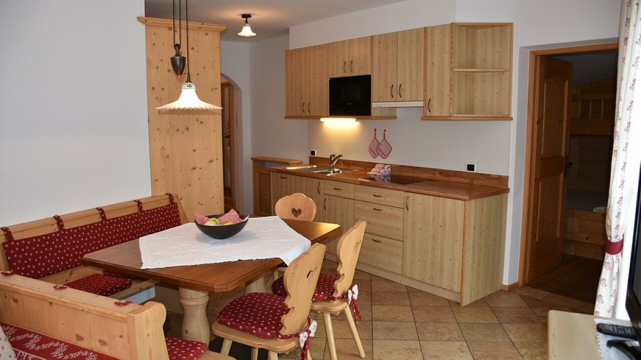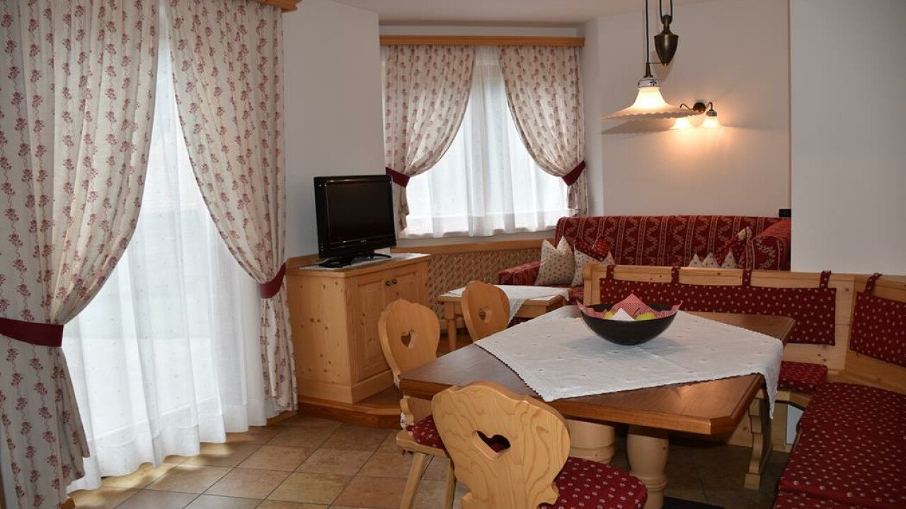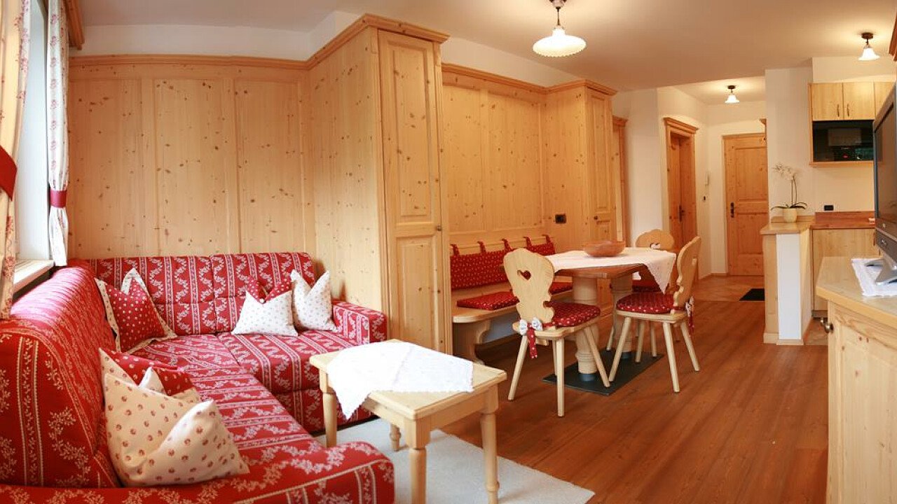 I confortevoli appartamenti in stile tirolese possono ospitare dalle 2 alle 6 persone e sono attrezzati di: soggiorno con divano letto, TV, WI-FI, angolo cottura ben equipaggiato, cassaforte, camera matrimoniale, bagno con doccia o vasca e phon. Le abitazioni al piano terra dispongono di giardino con due sedie a sdraio e ombrellone, mentre quelle al primo e al secondo piano sono dotate di balcone con una stupenda vista sulle Dolomiti e sul paese.