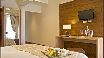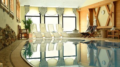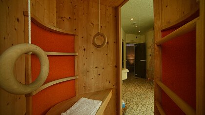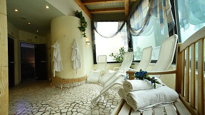L’area benessere arredata come un vecchio maso di montagna con tetto in scandole, boiserie in legno e balconcino fiorito, è attrezzata di piscina coperta, percorso Kneipp, sauna finlandese, alpinarium, zona relax, angolo tisane, nebbia fredda, doccia scozzese, zone relax e cabina a raggi infrarossi.