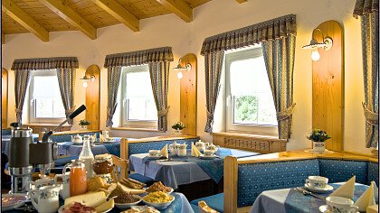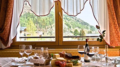 Nella luminosa sala ristorante dalle ampie finestre e con pavimento in legno antico si possono degustare ottime colazioni e deliziosi piatti trentini a base di ingredienti locali e di stagione. Il tutto abbinato alle migliori etichette regionali. In estate si organizzano dei barbecue nella valle incontaminata di Valpiana.