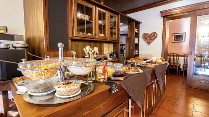 Nella sala da pranzo potrete godere della mezza pensione con una ricca colazione a buffet e una deliziosa cena a tre portate. Al mattino vi attendono: brioches, marmellate, pane, succhi di frutta, miele, caffè, cioccolata, latte, cereali, affettati, uova e molto altro.