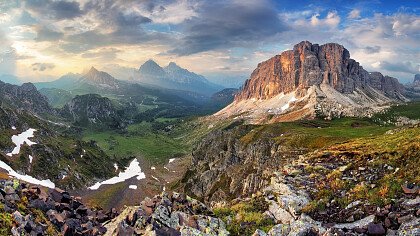 Qui, dopo tanta fatica, sarete appagati dal magnifico panorama verso la conca di Cortina D'Ampezzo, con le Tofane, la Croda Rossa, il Pomagagnon, il Cristallo e la Croda da Lago e più lontano le Tre Cime di Lavaredo e la Croda dei Toni.