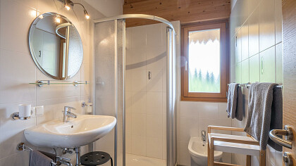 Anche nel bagno non manca nulla: WC, lavandino con mensola e specchio, doccia e bidet. Lo speciale dell'appartamento "Sunny" è la grande terrazza esposta a sud-est di 9 m², che invita a fare colazione all'aperto ed è il luogo ideale per godersi la tranquillità della natura.