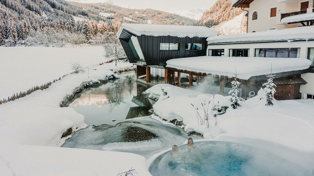La filosofia della struttura si basa sul rispetto dell’ambiente alpino e sulla riscoperta del valore dell’acqua, fonte di energia e di quiete: la sorgente di montagna nasce come ruscello, si trasforma in percorso Kneipp e sfocia in un laghetto naturale, dando vita a un’esperienza di benessere rigenerante.