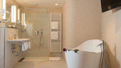 Dopo una bella escursione in montagna, rinfrescatevi nel laghetto con fanghi naturali o rilassatevi sul prato di fronte l’hotel. Nel lago è stata costruita una piscina in legno, dove potersi tuffare o passeggiare tutt'intorno ammirando il panorama circostante.