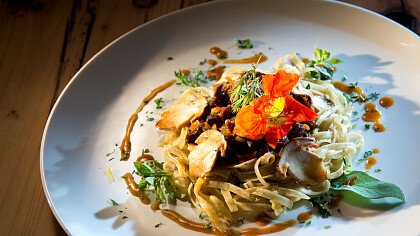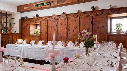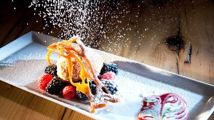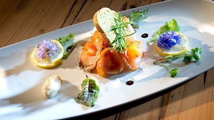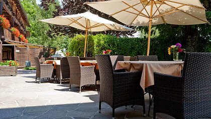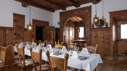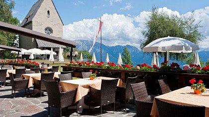Nell'elegante ristorante rustico si possono degustare raffinate specialità tipiche, nonché ottimi piatti mediterranei e internazionali accompagnati da eccellenti vini regionali e nazionali. Sulla terrazza panoramica si possono gustare abbondanti colazioni.