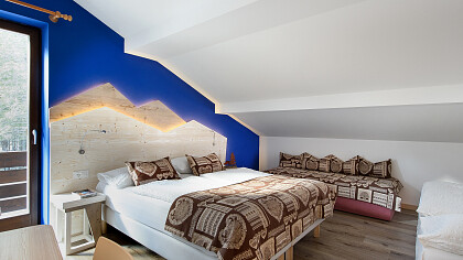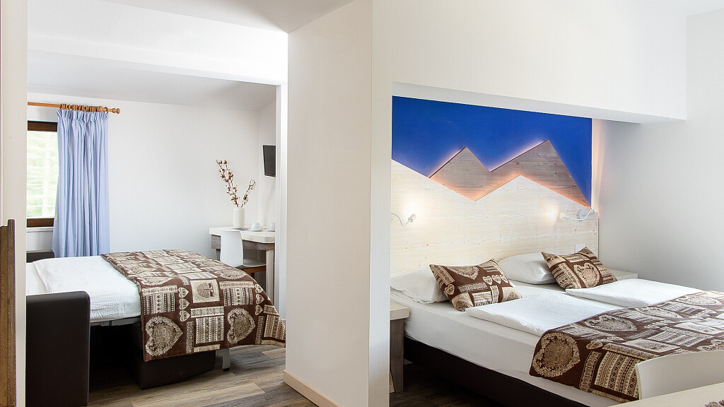 Le spaziose camere familiari, sono caratterizzate da un doppio ambiente comunicante. Hanno un letto matrimoniale king si...