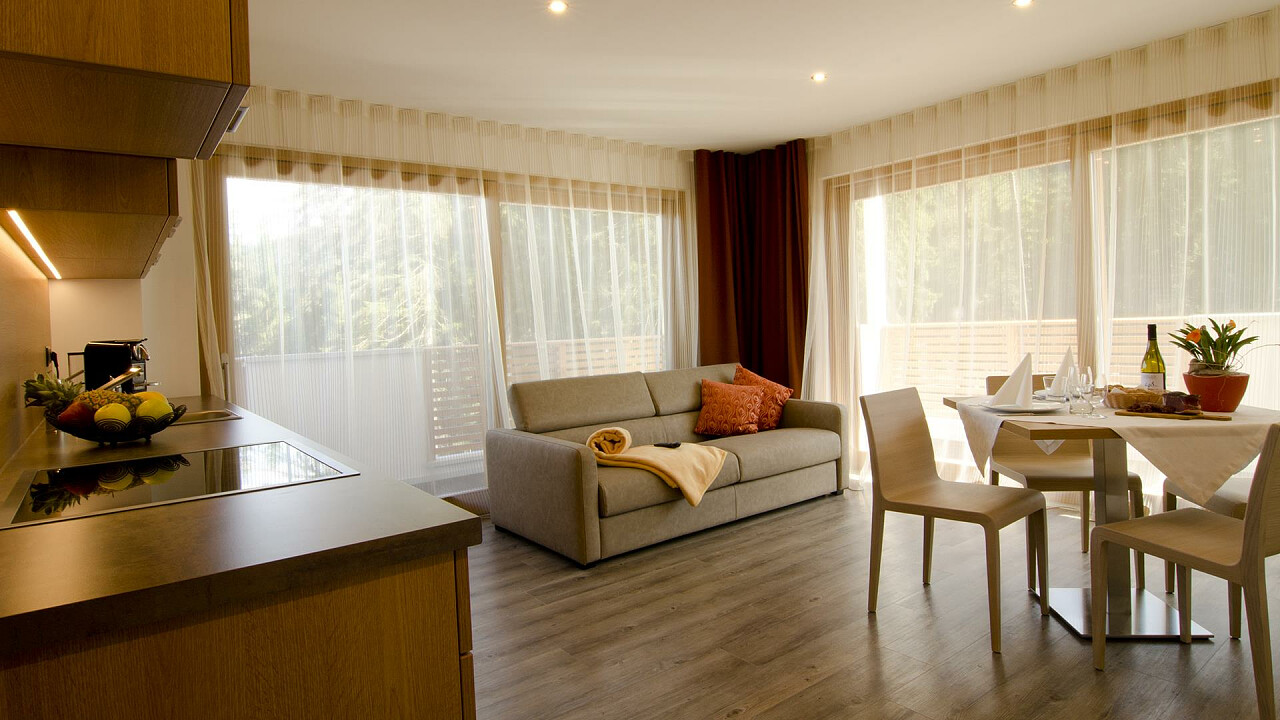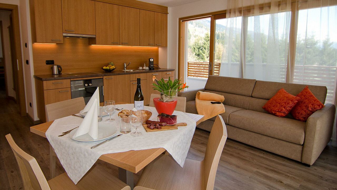 I nostri appartamenti ben attrezzati sono ampiamente vetrati e trasmettono la sensazione di alloggiare in mezzo alla natura. Godetevi il sole, il silenzio e l’idillio di Prato Drava sui nostri balconi larghi.