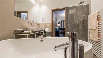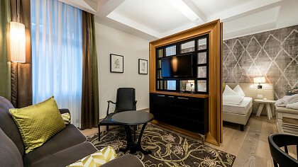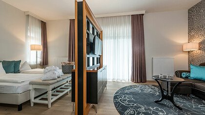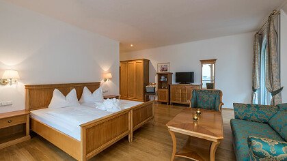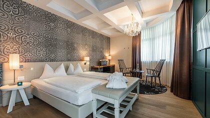 Le lussuose camere e suite dispongono di cassaforte, bagno con doccia, phon, TV, borsa wellness, Wi-Fi e balcone con vista sul paese o sulle montagne circostanti.