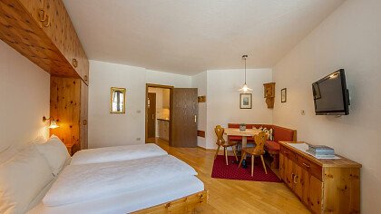 Gli accoglienti appartamenti arredati in legno possono ospitare fino a 6 persone e si compongono di: letto matrimoniale, cucina ben fornita con frigo e forno microonde, bagno con doccia, phon, cassaforte, TV, telefono e balcone con vista panoramica.