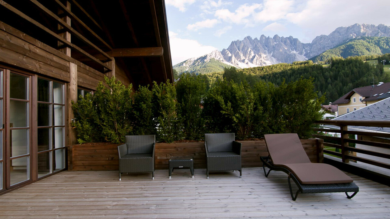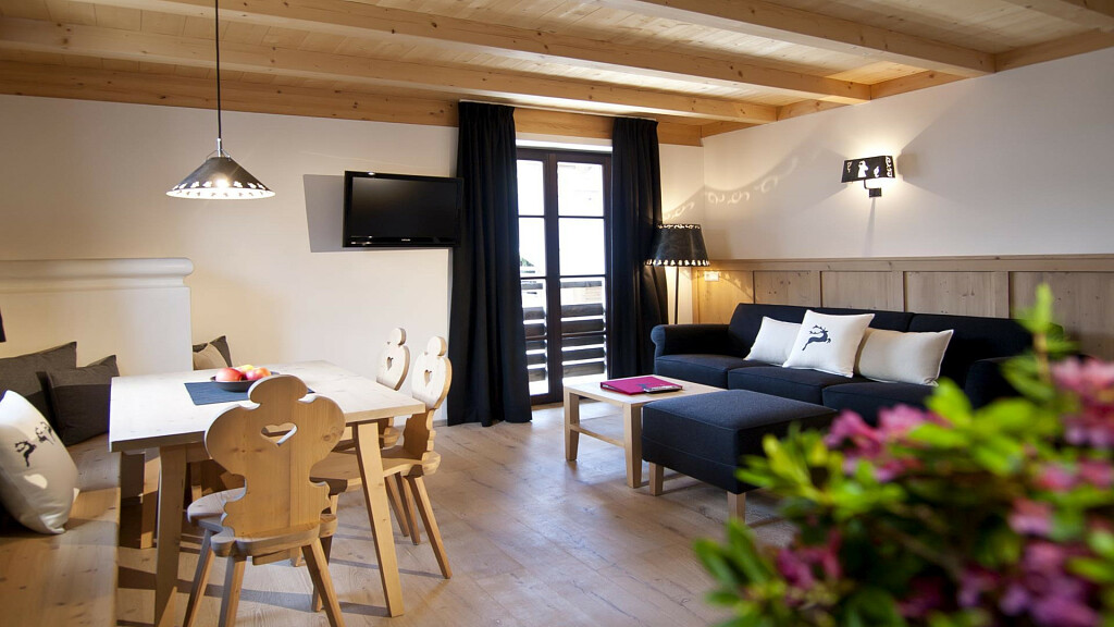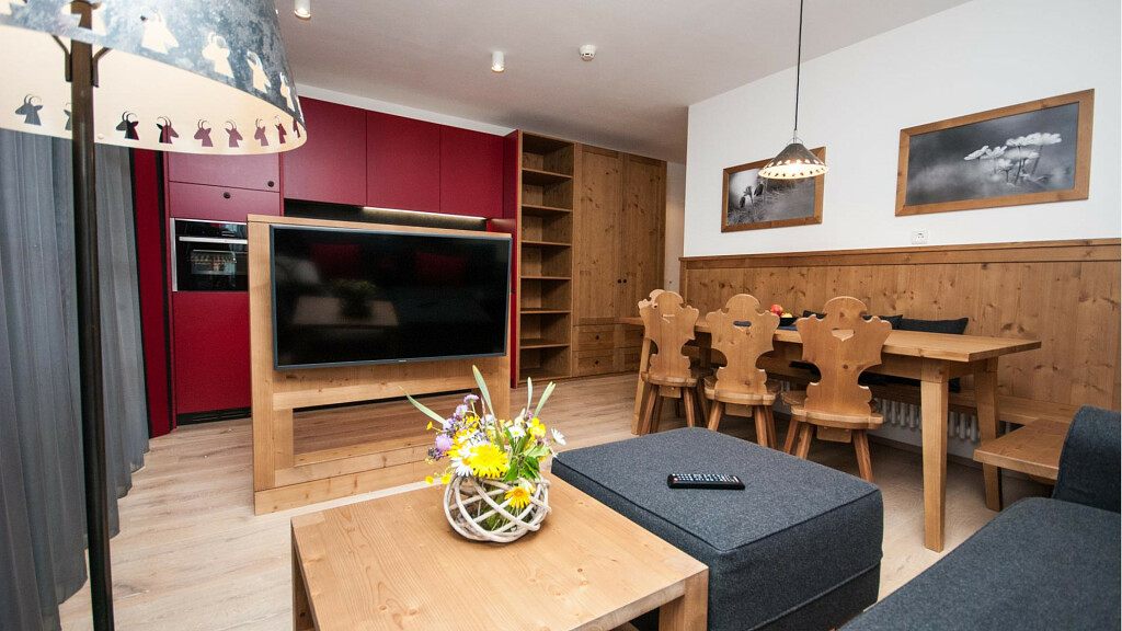 La struttura arredata secondo lo stile tirolese offre ampi e luminosi appartamenti dotati di: soggiorno con divano letto, cucina ben attrezzata, borsa wellness, Wi-Fi, angolo cucina, TV, WC e bidet, stufa tirolese con panca e balcone con vista spettacolare sui Monti Baranci o sulla Piazzetta Senfter.