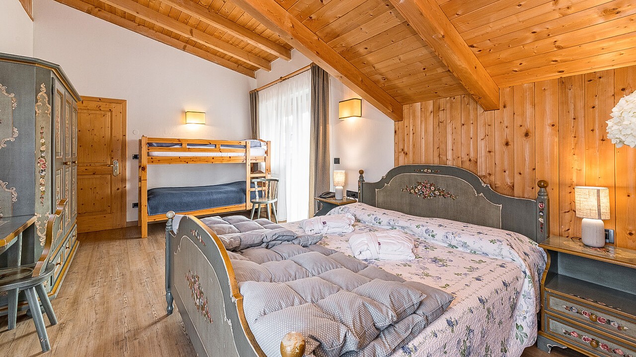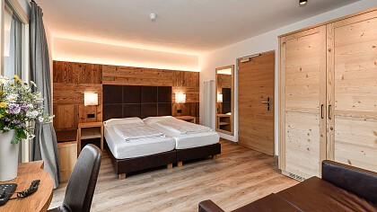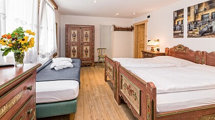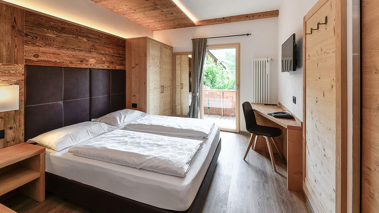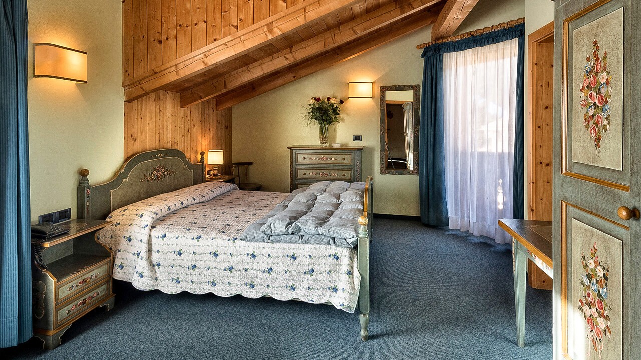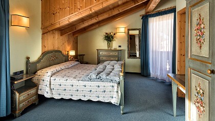 Le Camere Basic (solo una camera non è provvista né di balcone né di bidet) sono arredate in stile alpino, con pavimento...