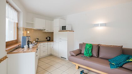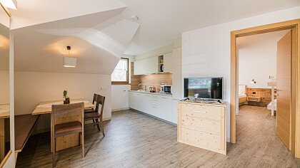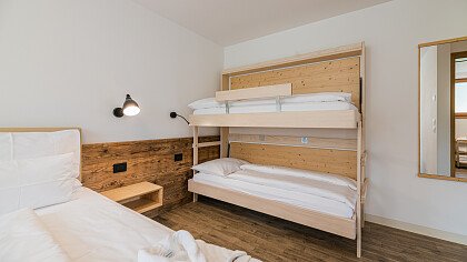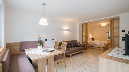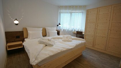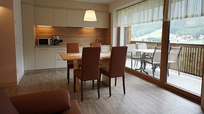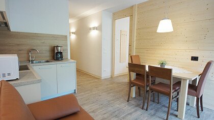Gli appartamenti dispongono di una o due camere da letto matrimoniale, cassaforte, cucina attrezzata, soggiorno con divano letto singolo o matrimoniale e TV, uno o due bagni con WC, doccia, fon e bidet, biancheria da letto e da bagno, balcone o terrazzo con vista sulle Dolomiti. In alcuni vi è la possibilità di aggiungere un letto supplementare o un letto a castello.