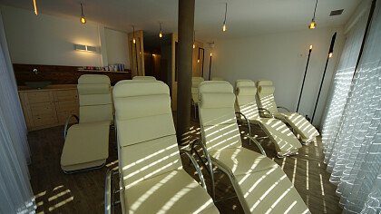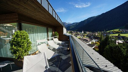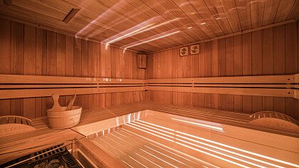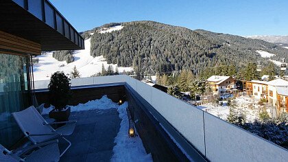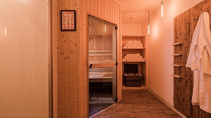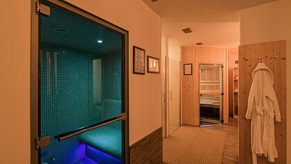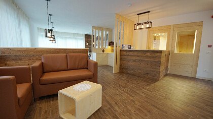 All'ultimo piano del Residence Plan de Corones, piccola area benessere con sauna finlandese, bagno a vapore, doccia sensoriale, sala relax e terrazza panoramica (accappatoi e teli per la sauna sono inclusi).