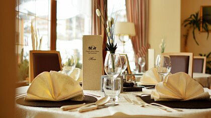 All'interno della spaziosa sala da pranzo del ristorante lo chef preparerà deliziose specialità tirolesi e mediterranee. Gli ospiti troveranno anche un’ottima colazione, una merenda pomeridiana a buffet e menù speciali per i vegetariani e i bambini