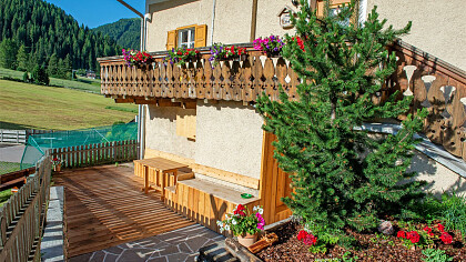 L’ampio terrazzo privato, sito al pianterreno, è rivolto a Sud ed offre una vista spettacolare sulle Dolomiti.