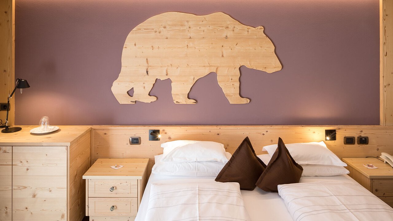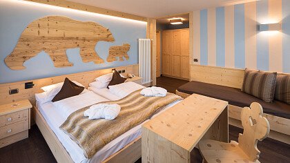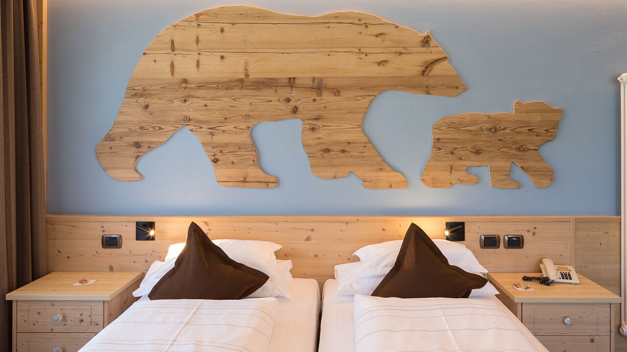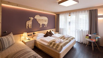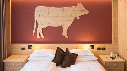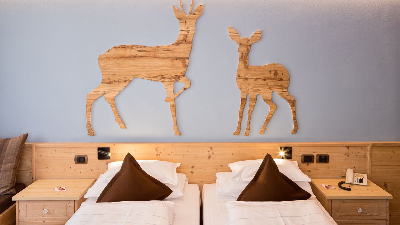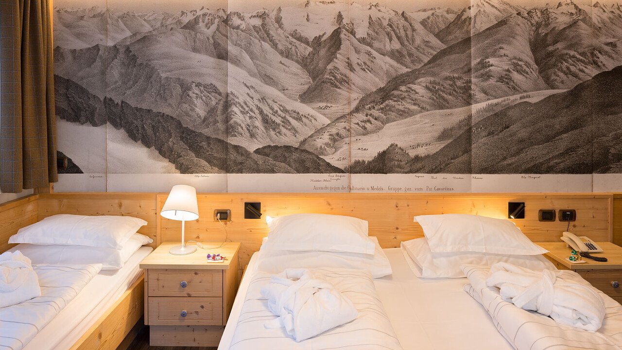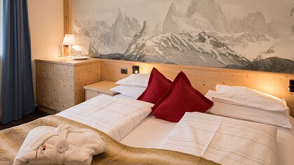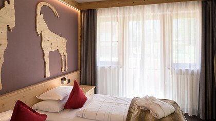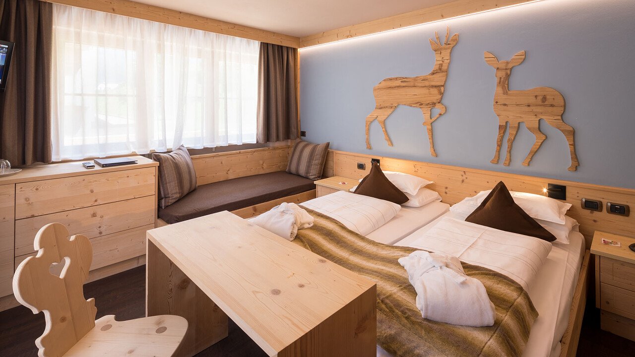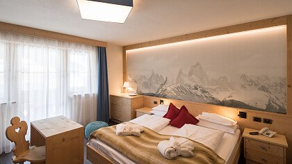 L’hotel a 4 stelle offre un’atmosfera rilassante e confortevole. Le camere sono molto curate, arredate con toni caldi in stile alpino, e dotate di bagno con doccia o vasca, WC, bidet, asciugacapelli, TV sat, telefono, cassaforte, angolo lettura e balcone con vista panoramica.
