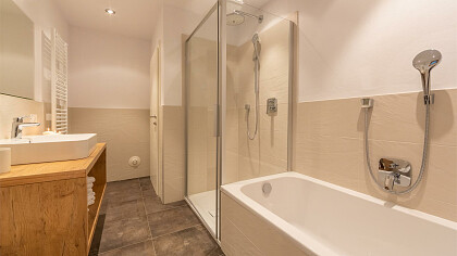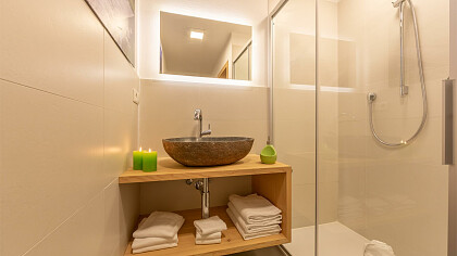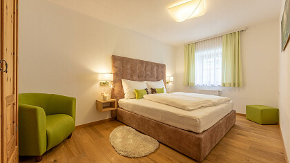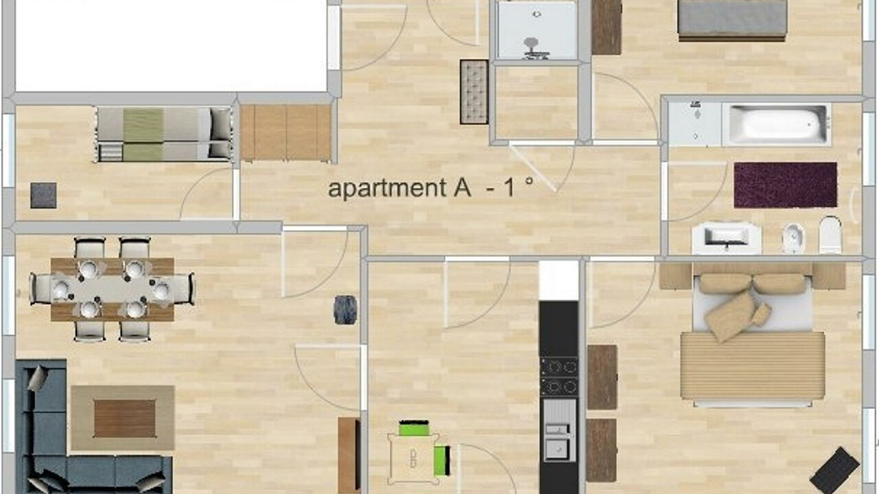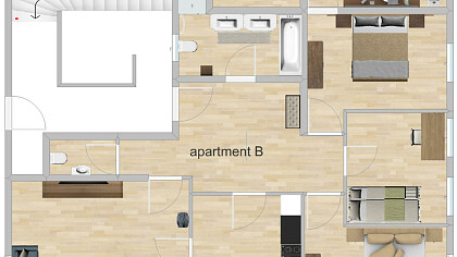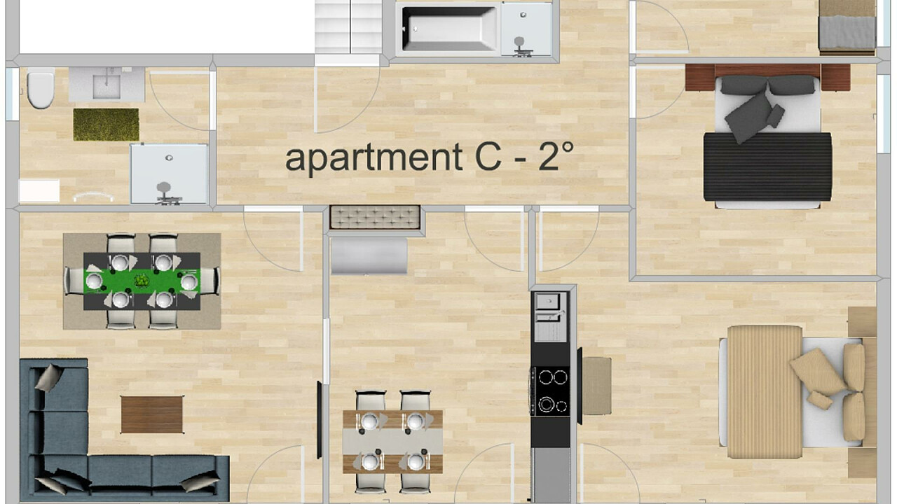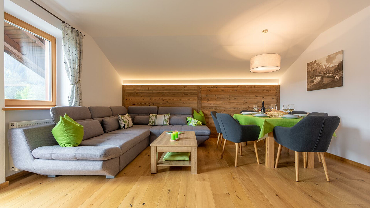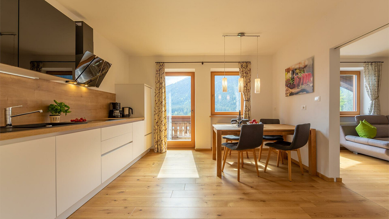 Tre appartamenti ampi con piú di 100mq di spazio abitativo ospitano un massimo di 7 persone. Tutte le unitá dispongono di una zona ingresso con WC, due bagni separati con doccia, bidet e vasca, 3 camere da letto (due con letto matrimoniale, una con letto a castello o due letti singoli), una cucina separata e modernamente equipaggiata, un salotto con zona pranzo/cena accogliente, un grande divano e caminetto. Il balcone al primo e al secondo piano ed una picola terrazza privata al piano terra offrono una buona visuale sull'idilliaco ambiente naturale.