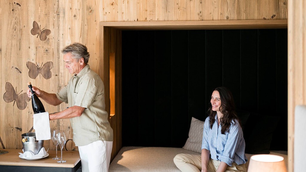 In ogni angolo della struttura si respira la genuina ospitalità. Gli ambienti spaziosi, dalla sala con caminetto alle cinque rustiche stube fino alla spa e alle camere e suite, sono dei veri luoghi di ritiro, dove sognare e rigenerarsi.