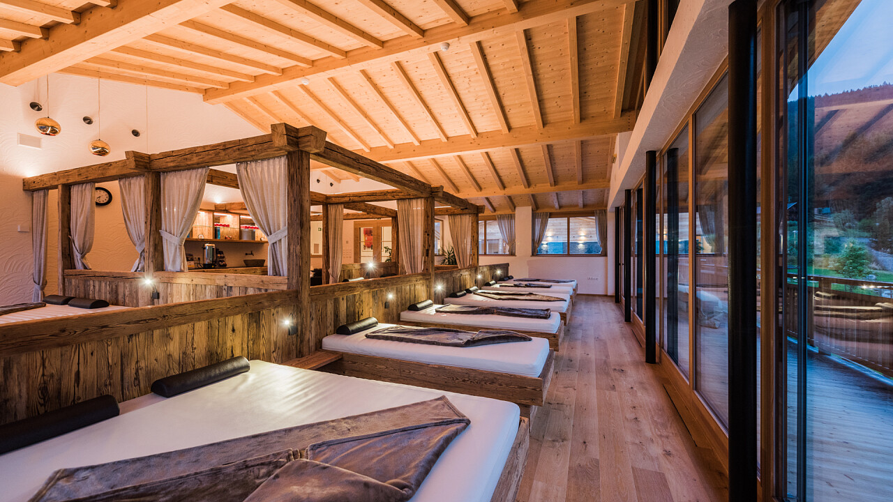 Rilassatevi e recuperate le energie nella splendida oasi wellness fornita di piscine interna con idromassaggio ed esterna, percorso Kneipp con acqua di sorgente dei Monti di Casies in giardino, sauna finlandese, sauna panoramica, family sauna, bagno turco aromatico, bagno di fieno tradizionale, sauna Brechelbad, area fitness, sala lettura e relax e terrazza soleggiata. Si effettuano trattamenti e massaggi nella beauty farm e si organizzano corsi di acquagym. I cosmetici naturali che vengono utilizzati sono certificati al 100% a base di erbe officinali biologiche, sviluppati e prodotti a Valdaora, in Alto Adige.