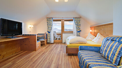 Camera con balcone esposto a sud e vista panoramica sulle Dolomiti, panca d’angolo con tavolo e sedie, alcune con divano...